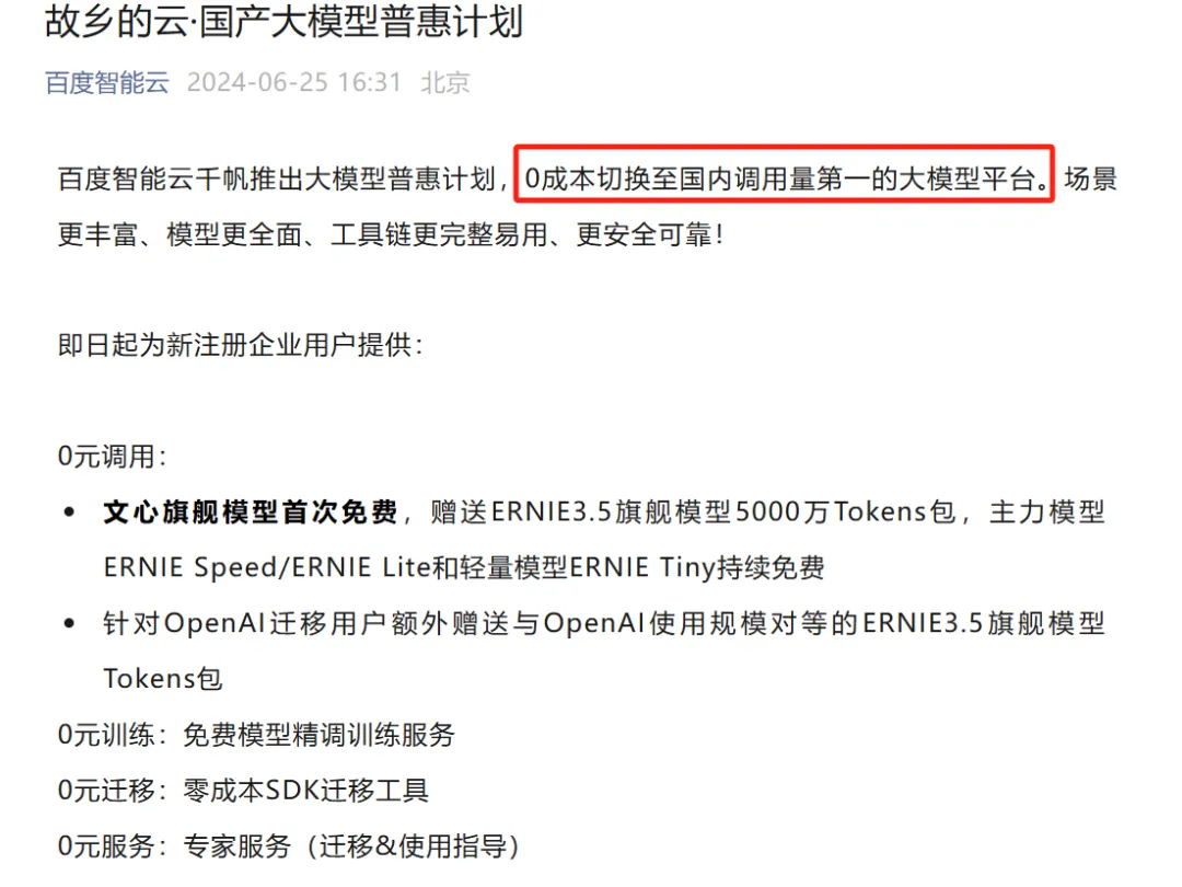 百度这边也积极响应,推出了“大模型普惠计划”:文心旗舰款大模型首次面向新注册的企业用户免费,并支持用户 0 成本切换至百度智能云千帆大模型平台。