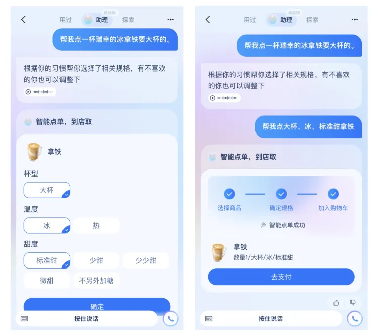 以支付宝智能助理正在测试的“智能点单”功能举例:当用户说出“请给我点一杯星巴克的大杯冰拿铁”,大模型先让 AI 具有屏幕感知能力,能“看到”小程序页面,再通过仿真执行能力,快速完成所有过去需要用户点击的步骤,用户确认并付款后,就能到附近的线下门店取咖啡了。