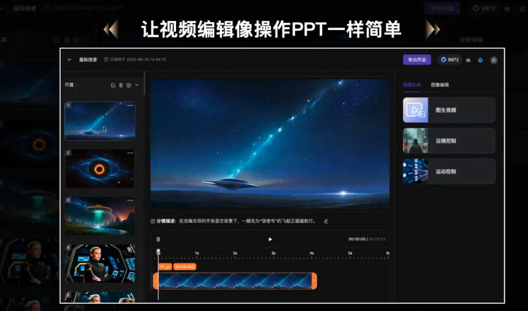 另外,在创作空间中,如果用户在查看分镜头的时候,发现有些细节需要完善,那么就可以通过编辑工具栏对分镜头做进一步的编辑,不再像传统的视频制作过程那样,需要专门的工具来制作,然后再进行复制粘贴等操作。