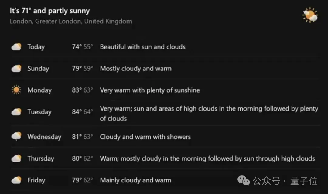 比如当这位博主询问伦敦的天气时,SearchGPT 直接就给出了一个列表,清晰地展示了未来一周的天气情况。