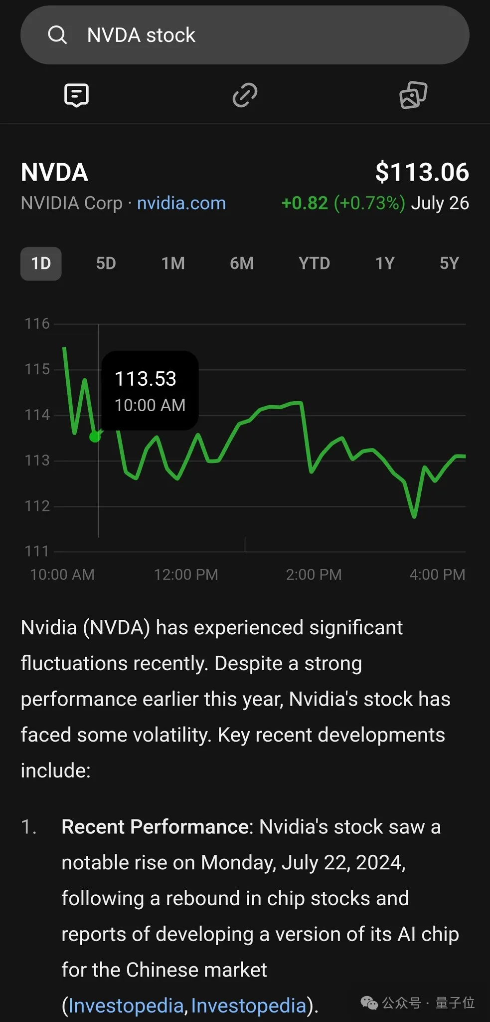 其他的一些问题也能看到这种直观的展示,比如搜索英伟达的股票时,可用在最显眼的位置看到股价曲线图。