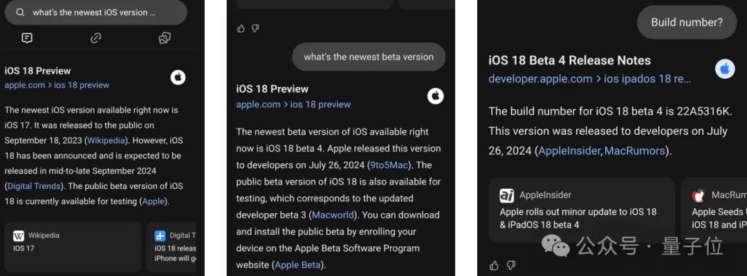 结果中首先用大字展示了结论——iOS18 预览版,然后详细说明了最新的正式版是 17,同时 18 也开始测试了。