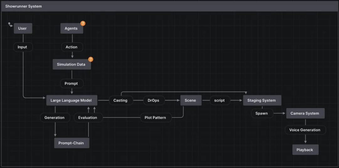 首先,Showrunner 会通过故事系统,获取标题、故事梗概以及模拟当前时间内发生的主要事件等高层次信息,从这些信息中,故事系统通过模拟数据作为提示链推断出 14 个场景。