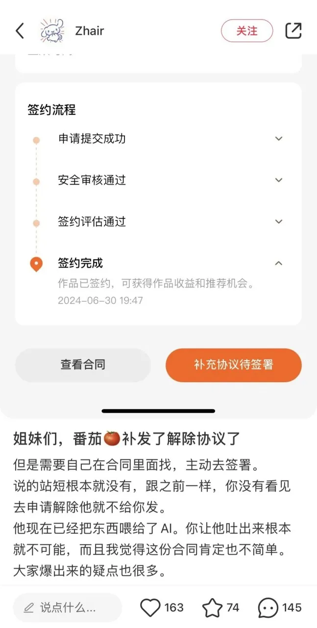 如今,距离番茄小说发出回应已经过去快半个月,像秋语一样仍然停更抗议的作者还有很多。他们抗议的不仅仅是隐藏在合约中的“陷阱条款”,还有平台可能试图利用他们辛辛苦苦创作的作品“喂养”出“AI 作者”,来取代他们。
