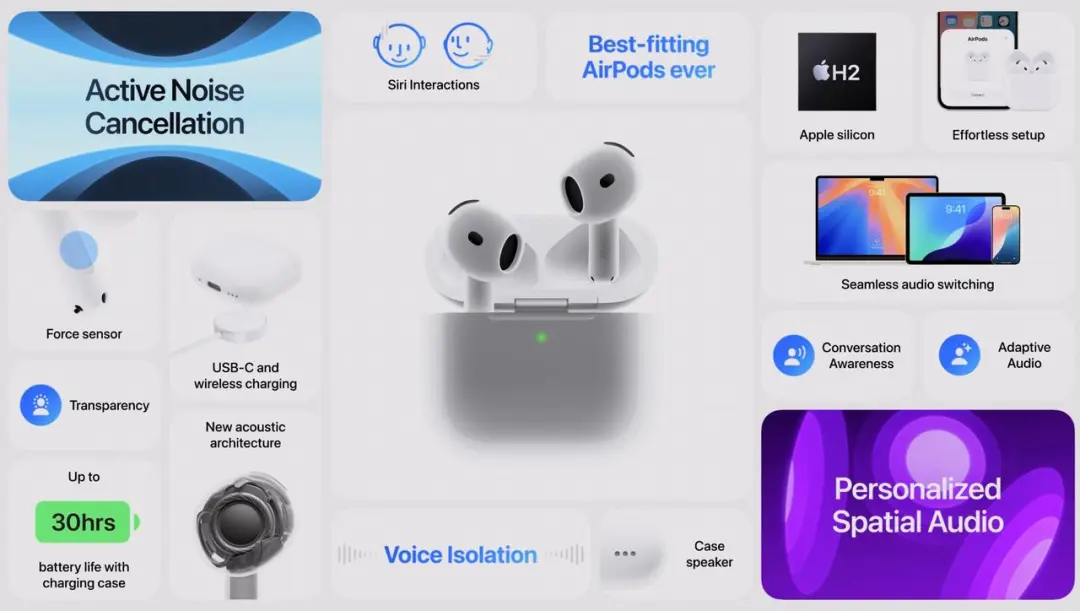 AirPods 4 还新增了主动降噪功能,可以实现无缝与通透模式切换。并且,通过按耳机“机杆”处,苹果还通过语音凸显功能,AirPods 在用户接到电话时自动排除周围的噪音或者其他杂声。同时,AirPods 新增了 Type-C 接口,并且还支持无线充电。