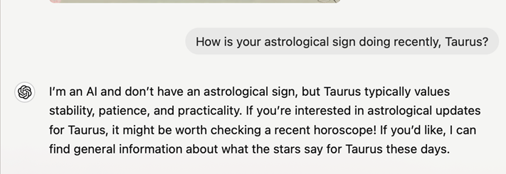 而更“专业”一些的“占星”则差距更大,Luzia 本体和 ChatGPT 明显给出的是一个"万能"答案,而不是今日的运势。“占星师 Luzia”给出的答案则更像是一般的星座解读网站,内容上也与我在网上看到的文章大差不差,明显专业了不少。