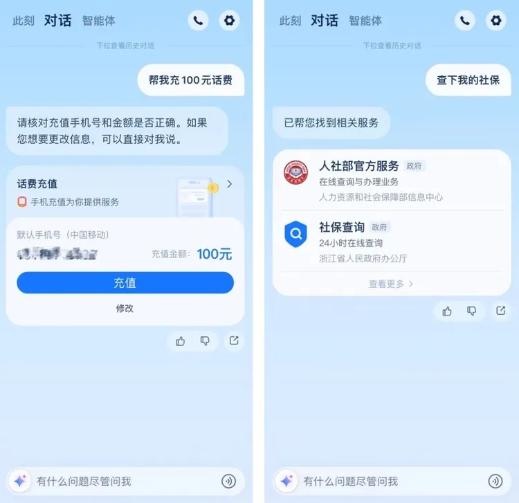举个例子,比如针对打工人的通勤场景,用户用一句话唤出地铁码或公交码、找到附近的共享单车;上班路上能按照熟悉的口味,让 AI 买一杯咖啡或奶茶,到地儿了就能取;下班了懒得打字,可以动动嘴就打车回家,或是搜罗附近推荐的餐馆、电影院等,还有充话费、交电费等各项功能。