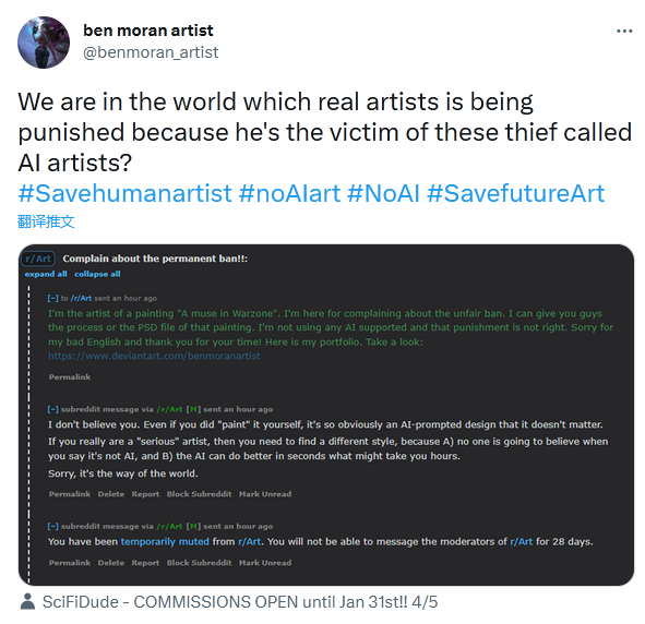 无独有偶,2022 年底越南的数位艺术家 Ben Moran 上传到艺术平台“Reddit/Art”的作品《Minh Anh Nguyen Hoang 》被误认为 AI 作品,以违反版规为由遭下架,帐号也被停权。他在 Twitter 上展示自己进行创作的过程与证明,并表示:“怎么会有真正的艺术家受罚?”“我真的需要放弃我的艺术风格吗?