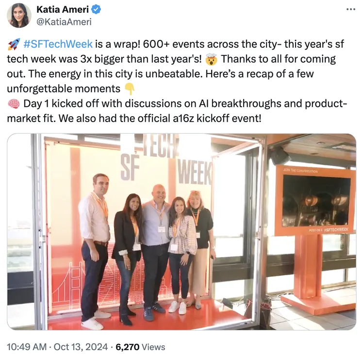 根据 A16z 合伙人 Katia Ameri 在推特的总结,刚刚落幕的旧金山科技周在短短 7 天内举办了 600 多场活动,平均每天接近 90 场,规模是去年的 3 倍。