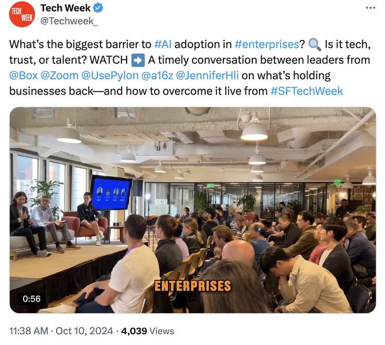 把全球几万名同频的人们聚集到一起,当创业者和人才、技术和产品、资金和客户在旧金山的深秋相遇,效果就是从早到晚的活动场场爆满。社交媒体上 A16z 的名字更是无处不在,任何关于科技周的讨论都在火热发酵、极速传播。