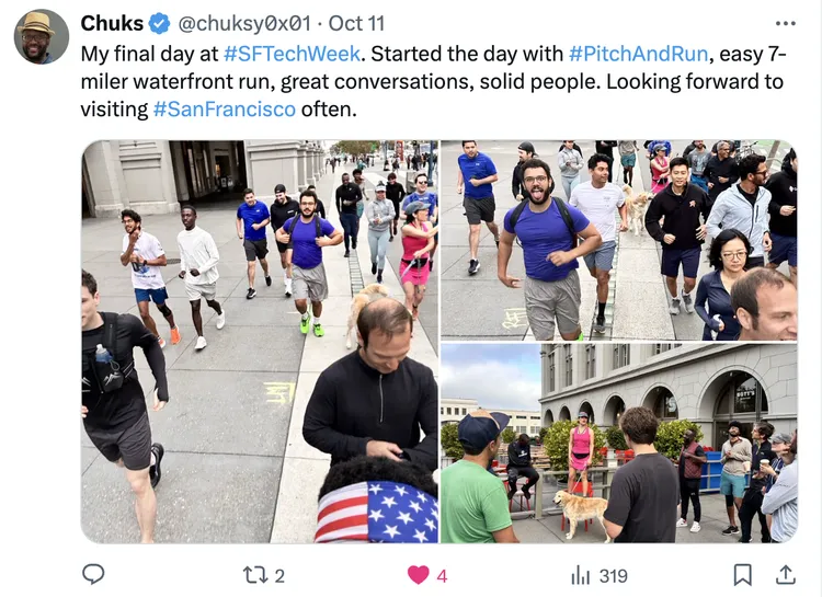 AI 公司创始人、技术发烧友和投资人们一边沿着旧金山海岸线休闲律动,一边交流想法谈合作。据组织者透露,近几年 Pitch and Run 已经促成了至少 8 笔投资。