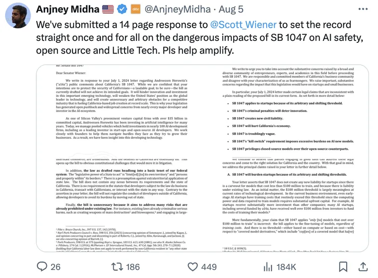 a16z合伙人Anjney Midha在X持续发声,是反对SB-1047法案的倡导者之一。