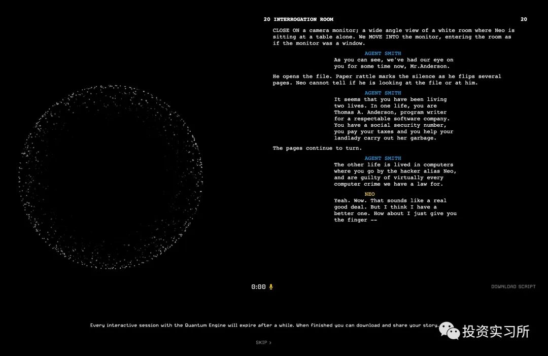 目前其互动效果非常类似 ChatGPT,事实上这块的能力也是基于 OpenAI 的语言模型构建的,但是与 ChatGPT 不同的是,它更具逻辑性,输出的也是结构化的数据,能够保留对过去交互的记忆,会根据之前的对话和剧情框架设定实时给出相应的互动,比方说你是在黑客帝国这个剧本里玩,那么无论你怎么玩,它都会用黑客帝国式的剧情给你反馈,不脱离游戏剧本与人物设定,将剧情交互限定在游戏故事的世界观中。 因此,可以认为它是基于 OpenAI 的模型和其它一些开源模型在具体游戏领域做的深度开发,也就是 a16z 所说的游戏制作中涉及的每一项资产都会有一个生成式 AI 模型,或者像 OpenAI CEO Sam Altman 所说的中间层机会,也就是基于这些大模型在某个垂直领域深度开发形成的应用型 AI 模型,这也是我非常看好的 AI 在未来的一个机会。 目前 Quantum Engine 发布的还只是非常早期的一个技术预览,但你已经可以直接在其网站体验游戏剧情的互动,不过暂时还只能体验《黑客帝国》的剧本,并且每次体验的时间有做限定。在即将发布的下一个版本里,将支持用户上传剧本的新功能,用户可以自由上传任何剧本,比方说《甄嬛传》,进而大大丰富用户的体验。 这个技术预览非常简单,打开网站根据提示开启麦克风权限后,在电脑上按下 F 键即可开始对话,如果在手机上,按下任何区域即可开始,右边会显示实时的对话字幕和剧情发展,目前支持英语、法语、中文、日语以及西班牙语。