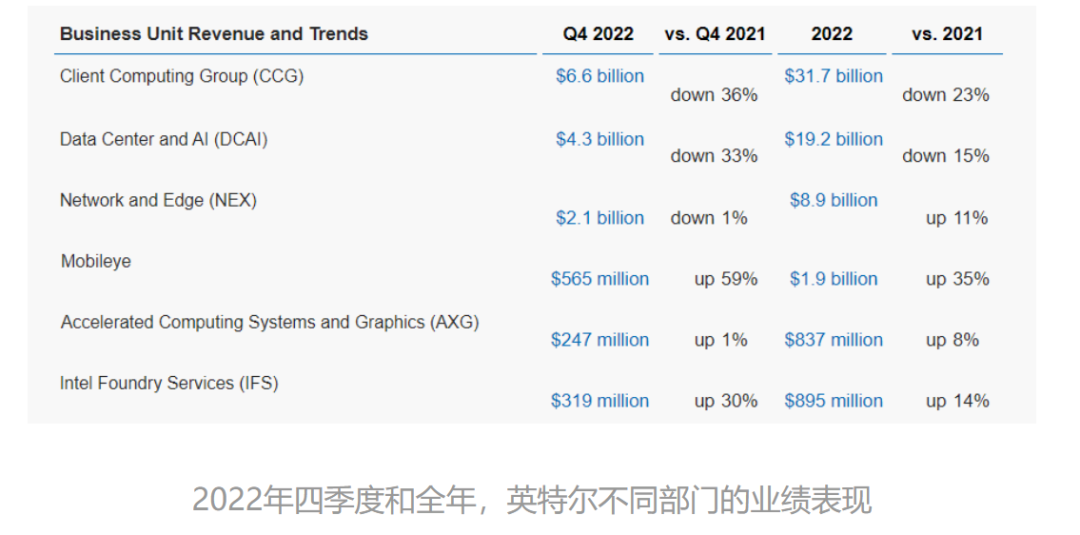 2022 年四季度财报显示,英特尔 140.42 亿美元的季度营收,较 2021 年同期的 205.3 亿美元下跌 32%;净亏损为 6.61 亿美元,而 2021 年同期的净利润则为 46.23 亿美元。从具体表现来看,作为英特尔最大的“现金奶牛”部门英特尔客户运算事业群,在第四季度净营收仅为 66.25 亿美元,2021 年同期则为 103.33 亿美元,同比下降 36%,全年营收为 317 亿美元,较上年同期下跌 23%。