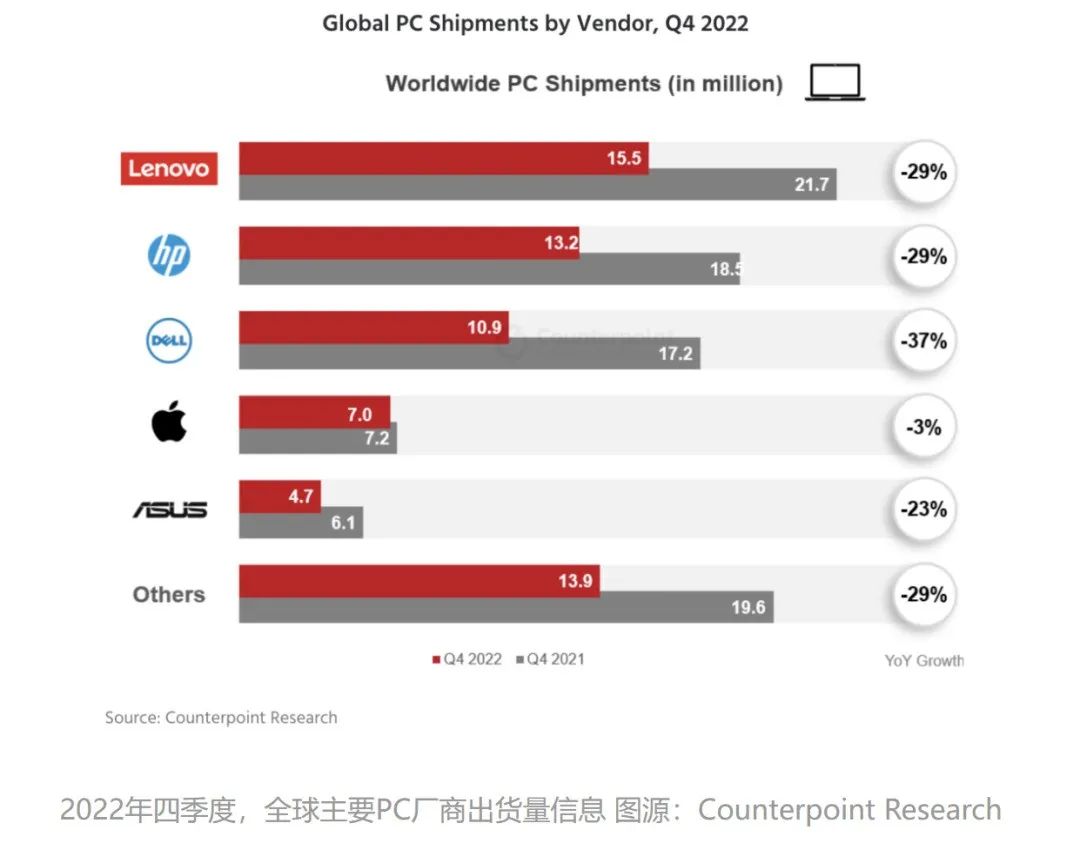 以全球前三位 PC 运营商联想、惠普、戴尔在 2022 年第四季度的表现来看,全球 PC 出货量暴跌就不难理解,2022 年第四季度,联想、惠普的出货量均下滑了 29%,而戴尔的出货量下滑更为惊人,达到了 37%。排名前五的厂商中只有苹果的出货量跌幅为个位数,跌幅为 3%,其余厂家最低跌幅为 23%,其他品牌的跌幅也近 30%。