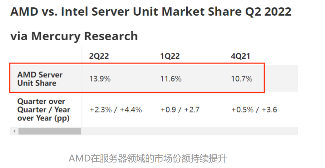 第三方机构数据显示,由于英特尔第四代至强处理器多次延迟推出,AMD 这两年几乎每个季度都会在服务器市场取得增长,整体份额目前已达到两位数。此消彼长,英特尔的市场份额不断下滑,而竞争对手在不断上涨,这也是分析师表示震惊的原因所在。