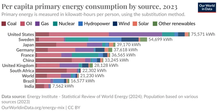 算力的背后是能源,发达国家与高能耗之间存在密切关联,如果我们以人均发电量(千瓦时,kWh)进行图表对比可见。换言之,获取能源过剩是文明进步显现的必要条件。毕竟,在基本生存层面如农业之上叠加了制造业、交通运输、公共服务、城市化和计算等新层次,这些都需要能源的支持。