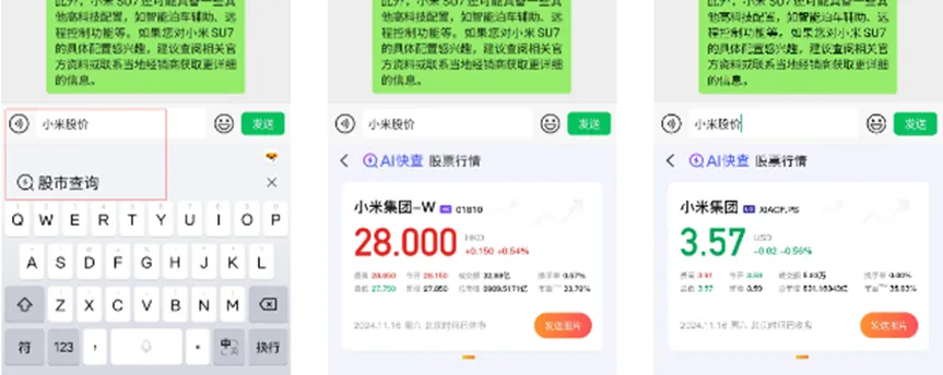 如输入小米股价,候选区会出现“股市查询”按钮,点击之后即可查看小米集团美股和港股数据,非常完整,用户还可以一键把股价信息图发送出去,全程都在聊天页面,不用进行任何跳转。