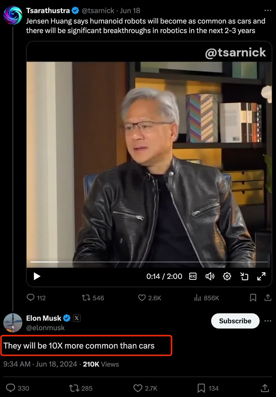 在关于人形机器人未来在人类生活中重要地位的看法上,黄仁勋也与马斯克不谋而合。