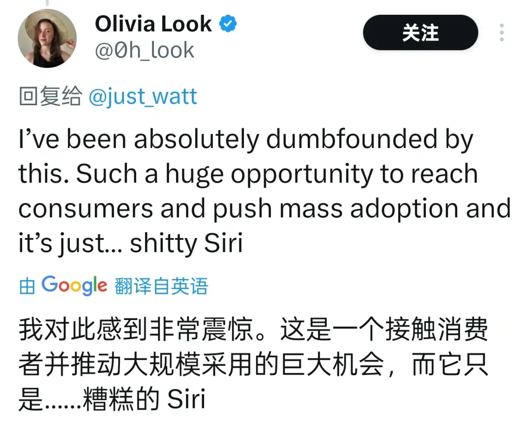 还有不少受访者直言,在好奇心得到满足之后,AI 功能的使用率会进一步下降。从数据就能看出,大部分用户对 AI 功能不感冒,对手机体验的提升十分有限。海外网友 Olivia Look 在 X 平台上表示,苹果 AI 是一个接触消费者并大规模采用的好机会,然而这只是一个“糟糕的 Siri”。话里行间也能看到,用户对 Apple Intelligence 功能并不满意。