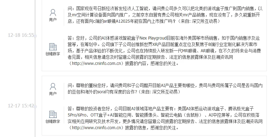 日前,创维数字在投资者互动平台进一步表示,公司的 AI 体感游戏智能盒子 Nex Playgroud 目前在海外美国等市场销售,而国内的销售因为涉及运营等还在筹划中;并表示,在持续投入研发新一代 MR 眼镜、AR 眼镜,不久将与消费者见面。