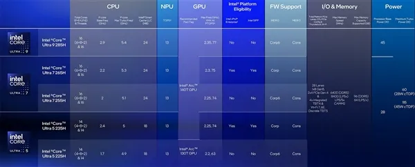 实话说,配置有点过于雷同了,从 Ultra 9 285H 到 Ultra 7 255H,关键的核心配置都几乎没有变化,三款处理器只有最高主频有略微差距。在实际使用中,U9 285H 与 U7 265H 的性能差距可能会非常小,对于消费者来说,如果为了性能而购入更高价的 U9 285H,恐怕并不会得到明显的提升。
