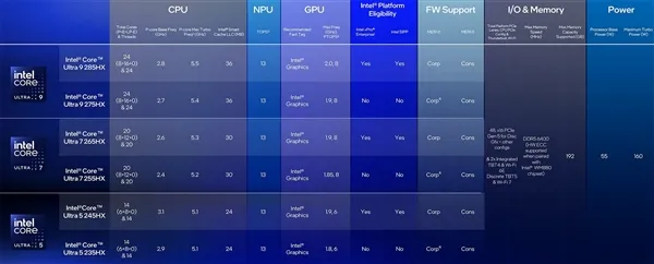 Ultra 9 285HX:24 核 24 线程(8P+16E),4 个 GPU 核心,13TOPS 算力,最大主频 5.5GHz