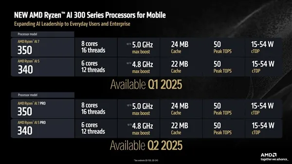 Ryzen AI 5 340:6 核 12 线程,最大主频 4.8GHz,22MB 缓存,50TOPS 算力