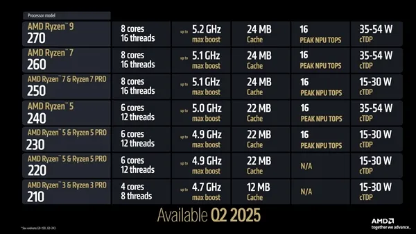 相较于前面几个系列,Ryzen 200/Pro 200 系列的主要针对中低端产品线设计,在提供一定的 AI 算力的同时更具性价比,估计会在轻薄本和入门游戏本上大量看到这些处理器的身影。不过,老实说这些处理器的规格看起来都似曾相似,恐怕就是老面孔+NPU 后做出来的马甲处理器,与 Ryzen7 8845HS 等型号类似。