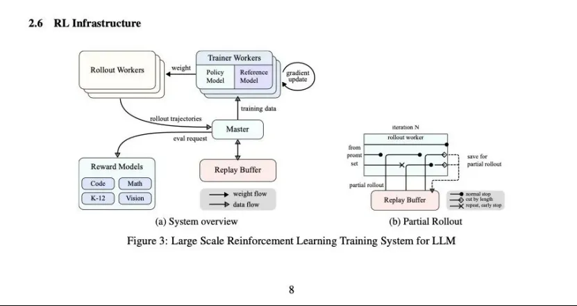 为了适配强化学习训练,Kimi k1.5 专门设计了特殊的强化学习框架,作为基座来支撑整个训练系统。