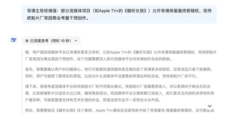 DeepSeek-R1 的深度思考模式会展示详细的思维链过程,这种“透明化推理”让用户不仅能获得答案,还能观察 AI 的思考逻辑,甚至反向学习如何拆解复杂问题。