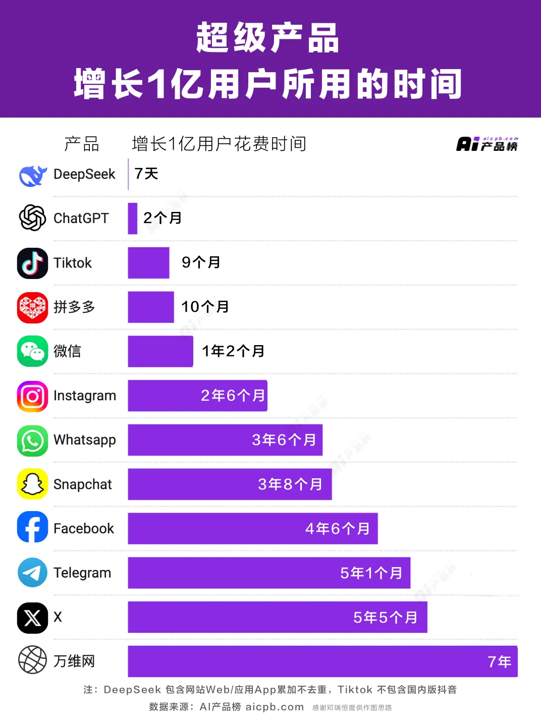 不仅如此,DeepSeek 还创造了许多记录。据 QuestMobile 数据显示,DeepSeek 在 1 月28日的日活跃用户数首次超越豆包,随后 7 天狂揽 1 亿用户,超越 ChatGPT 的用户增长速度,成为史上用户数增长最快的互联网产品。
