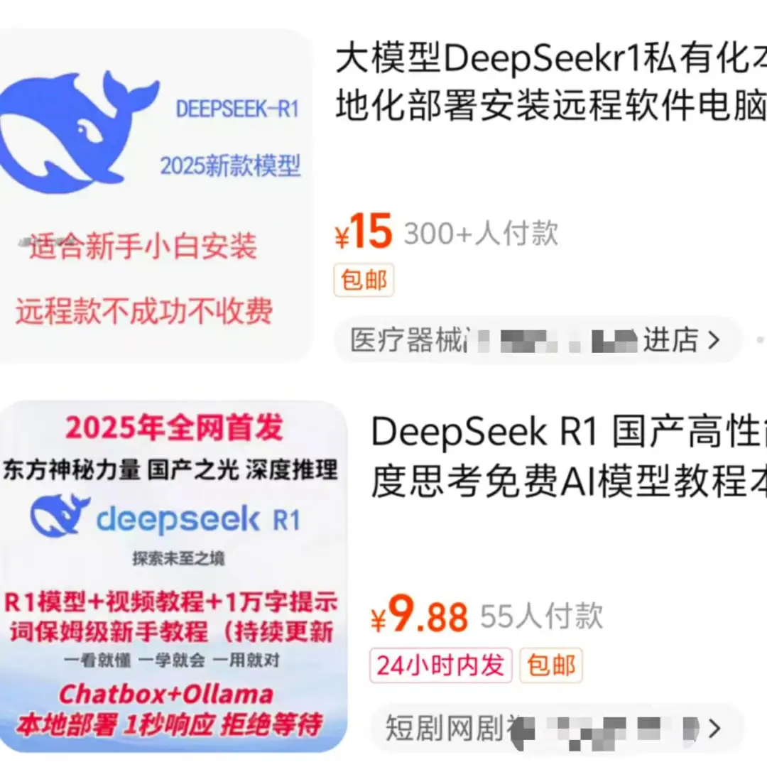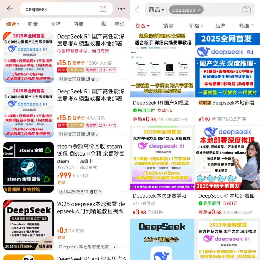 在淘宝、拼多多等电商平台,搜索 DeepSeek 的关键词,默认展示的便是有关 DeepSeek 的本地部署教程、从入门到精通的学习视频,价格多在几毛到十几元之间。