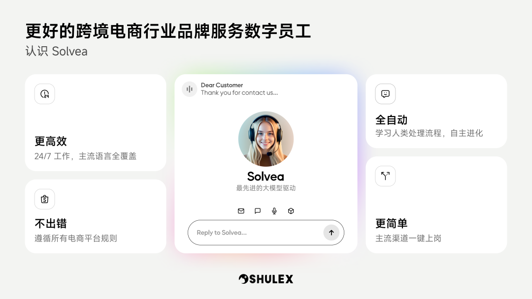 Shulex 创新推出的品牌客服代表 Solvea(Shulex客服AI Agent)以"技术+场景+合规"体系重塑服务标准。深度融合生成式 AI 与多智能体架构,内置电商行业知识图谱精准解析电商政策、跨境退货等复杂场景。提供行业最高的准确率和解决率,通过 ISO 27001 认证及 GDPR 合规框架实现全链路数据防护,支持 50+ 语种实时互译与 7×24 小时全球响应,为电商企业提供高转化、强合规的 AI 服务引擎。即将推出的语音/电话客服数字员工将扩展多元化场景服务能力。