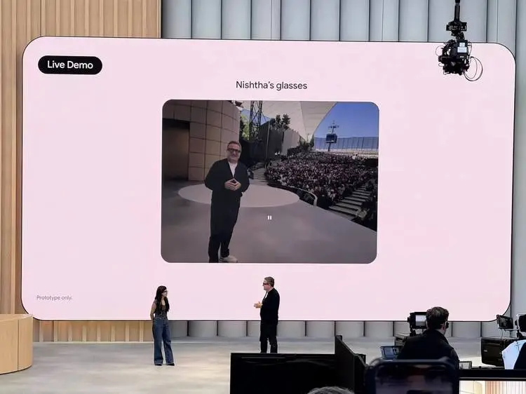 在喧嚣的 I/O 后台,演示者 Nishta 戴上了这款看起来与普通眼镜无异的 Android XR 眼镜,为观众带来第一视角的体验。