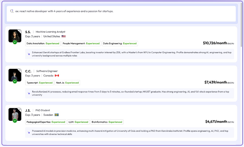 AI 可以通过用户自然语言描述,以及上传的简历与资料,自动为用户匹配合适的职位。而针对雇主,Micro1 提供的“AI招聘官”,也可以筛选符合雇主录用条件的技术人才。此外,Micro1 还提供 AI ChatBot 解决招聘流程中的常见问题(远程办公规则、薪资等)。