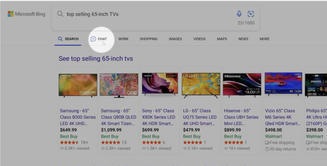 在微软的演示中,给出了挑选电视的例子。当你在搜索引擎中输入「最好的 65 英尺电视」,Bing 就会为你罗列出不同的产品。在展示形式上,Bing 的回答会在页面的右边栏框中,这样保证了用户可以同时看到传统搜索引擎给出的链接、以及生成式语言模型给出的综合回答。这也是微软所谓的「副驾驶」体验。