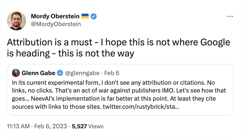 而没有显示引用来源,也招致了搜索引擎产的行业人士对目前产品形态的不满。「引用必须要有,希望这不是谷歌前进的方向,这样不对」,「在目前的实验形式中,我没有看到任何的归因或引用,没有链接,没有点击。这是对出版商的战争……」两位行业人士评论道。