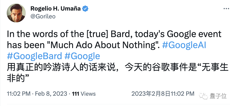 还有网友犀利吐槽:用真正的 Bard 的话来说,谷歌就是在“无事生非”(莎士比亚作品)。