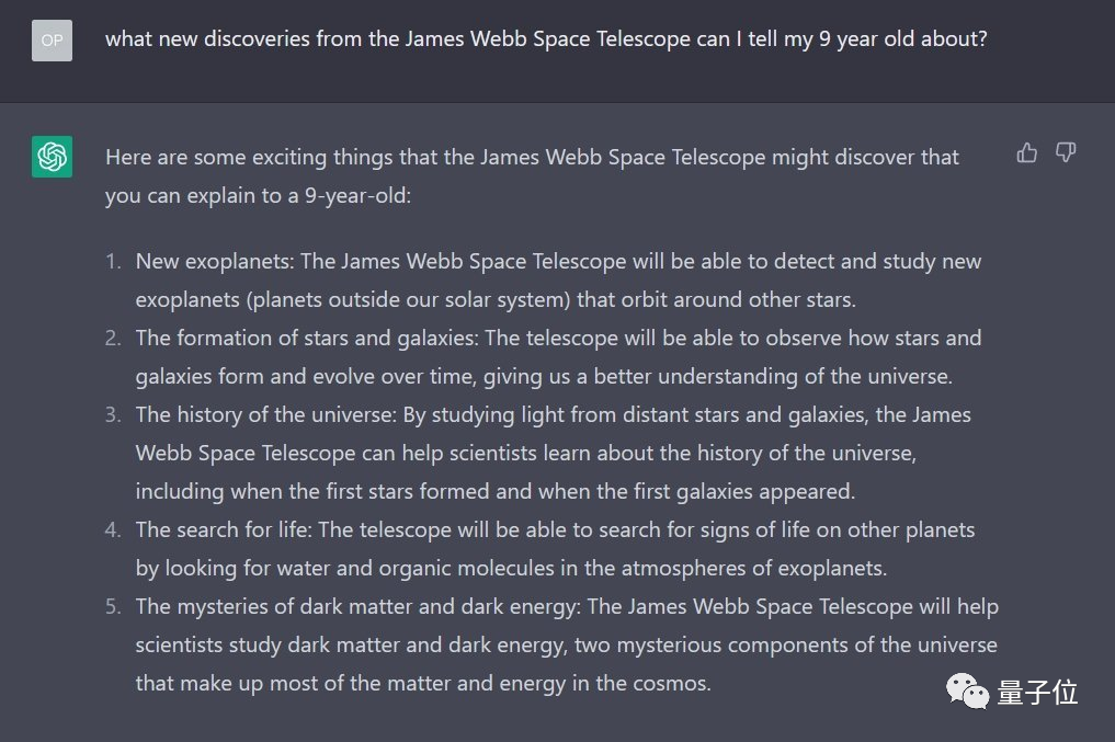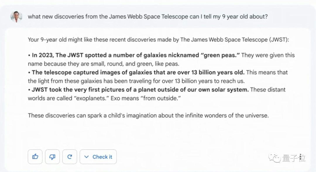 Bard 的消息就明显灵通一些,列举出三个新发现。末尾还贴心地附上一句“这些发现可以激发孩子对宇宙中无穷奇妙的想象”。