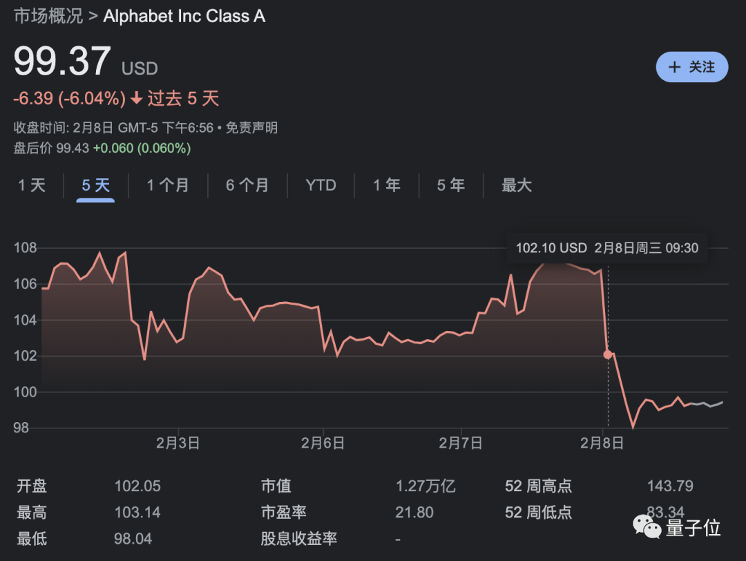 直播一结束,谷歌的股价就呈现出了一条醒目的下降曲线,收盘时已跌超7%,市值一夜蒸发 7000 亿。