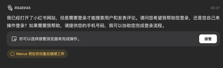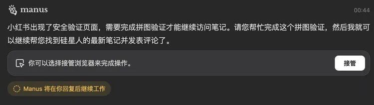 Manus 成功打开了网站,但在登录和安全验证环节,几次请求用户“接管”浏览器来辅助完成扫码和拼图验证。
