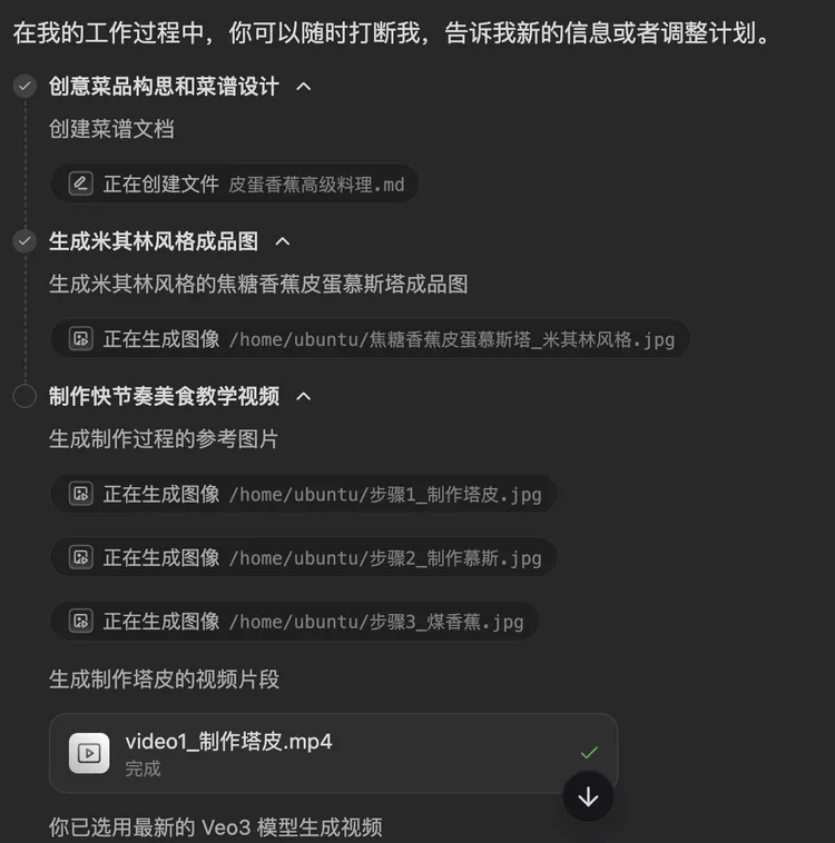 Manus 接到指令后,立刻规划好了任务步骤,创建菜谱,生成参考图片,然后调用 Veo3 模型生成了有原声音频的独立的视频片段。