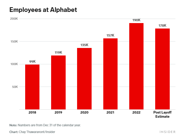 该公司在 2021 年和 2022 年雇佣了数万名新员工,在大流行病推动其业务蓬勃发展的情况下,其员工人数在 2021 年至 2022 年期间增加了近 30,000 人。然而,随着广告支出和收入的缩减,Alphabet 被迫削减开支。