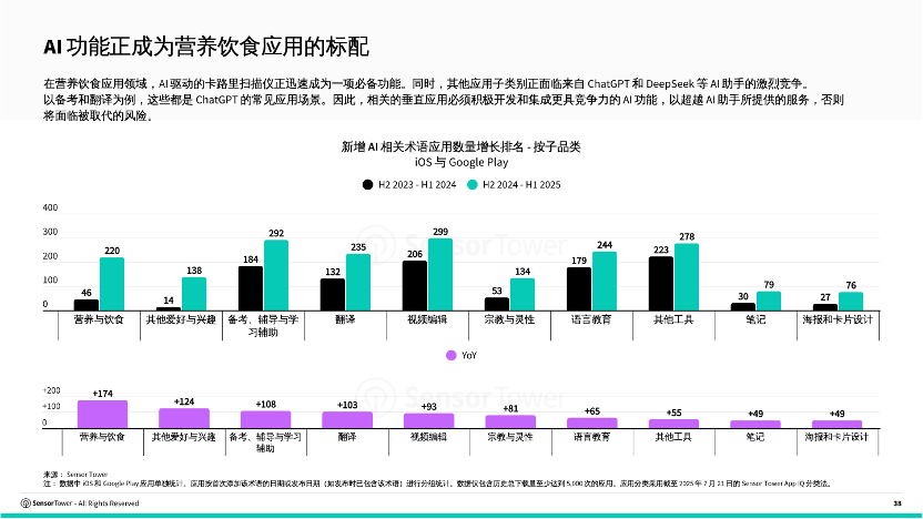 报告中,Sensor Tower 对比了“2023 H2-2024 H1”与“2024 H2-2025 H1” 两个时间段各品类下在名称中加入“AI 相关术语”的产品数量(如上图),所有统计品类中,符合该条件的产品数量都有增长。