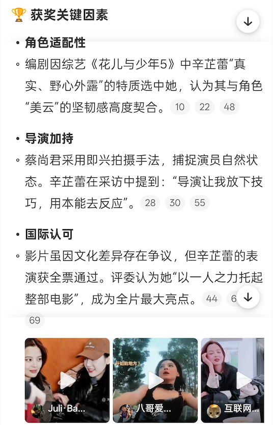 介绍获奖金句时,DeepSeek 和微博智搜提供的内容差别不大,均将辛芷蕾真诚又充满力量的获奖感言摘录出来。不过微博智搜还是提供了惊喜,回复中有很多视频内容,只需点击,即可观看 Live 版获奖金句,临场感更强。