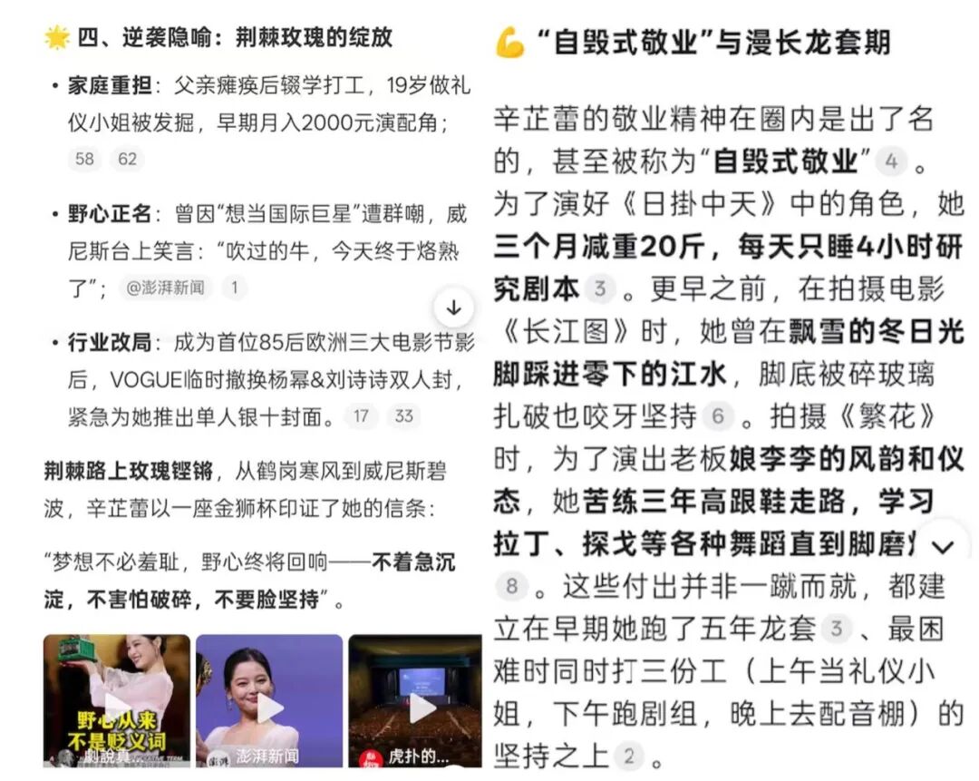 综合来看,在娱乐层面,微博智搜几轮问答下来,提供的回复更精准,并且内容来源多元,有官方账号背书、娱乐圈知名大 V、明星当事人以及具有信服力的粉丝大号,尤其是在精准度上值得信服,由于本身就是社交媒体,大V博主分享的辛芷蕾获奖视频,微博智搜还能以“多模态”形式展现金句。反观 DeepSeek 只能反馈门户网站的图文内容,缺少临场感和共鸣。
