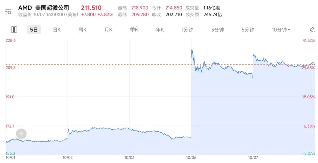 消息一出,资本市场瞬间沸腾,AMD 的股价在当天交易中一度飙升超过 34%,最终收涨 23.71%,市值一日之内激增近 800 亿美元,创下九年多来的最大单日涨幅。