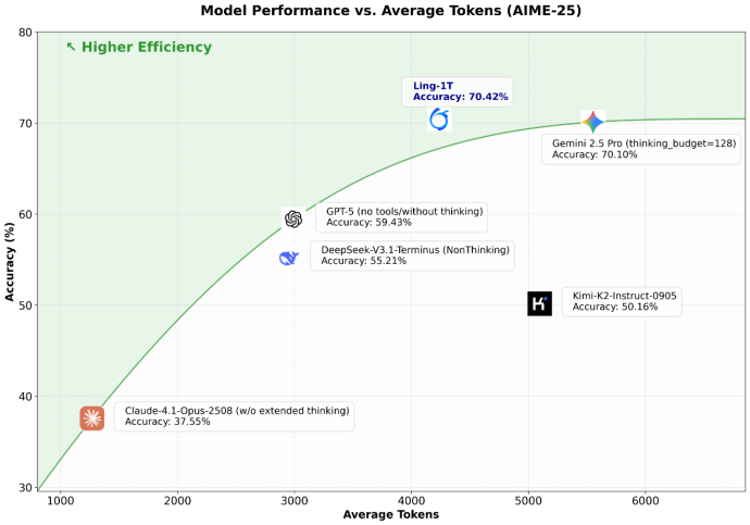 Ling-1T 在 AIME 25 测试中,与 DeepSeek-V3.1-Terminus、Kimi-K2-Instruct-0905 (开源)以及 GPT-5-main、Gemini-2.5-Pro (闭源)这些旗舰模型对比,展示出更短的思考路径和更高的推理准确率,能做到支持 128K 长文本窗口处理能力,每个 token 做到约 50B 参数的激活量。