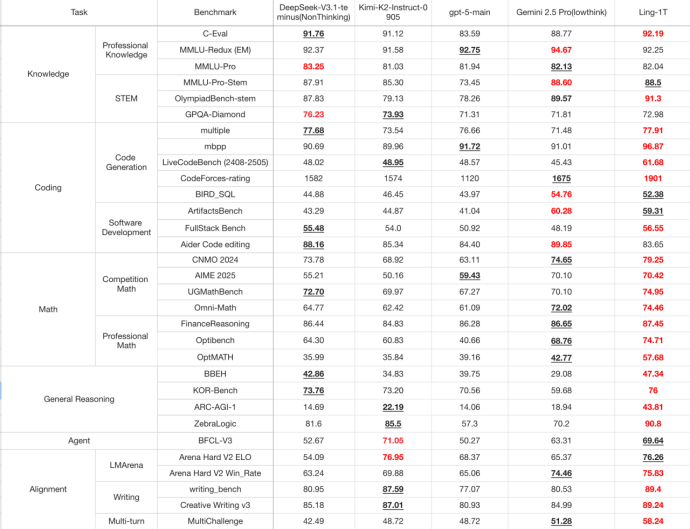下图是 Ling-1T 在部分权威基准评测的表现,红色加粗代表 Ling-1T 的得分获得 Top1,黑色加粗下划线表示 Top2: